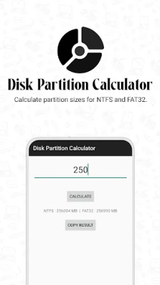 Disk Partition Calculator is a simple tool for calculating Windows OS disk drive partitions, calculating NTFS and FAT32 partition sizes. The application will try to calculate, for a targeted partition of 100 GB, the correct GB size for the partition to be displayed as 100 GB (and not 99.8 GB).