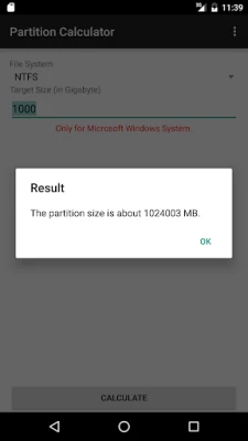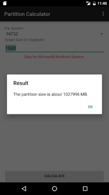 If you are tired of seeing the non-integer size of partitions in computers or mobile devices, Partition Calculator might help. Just input the size of partition you want to divide, Partition Size Calculator will give you the answer which is very very close to an integer result. Due to the rounding, the applications might not always give you a size in integer. Features: - Clear and simple - Support FAT32 and NTFS - Fast results